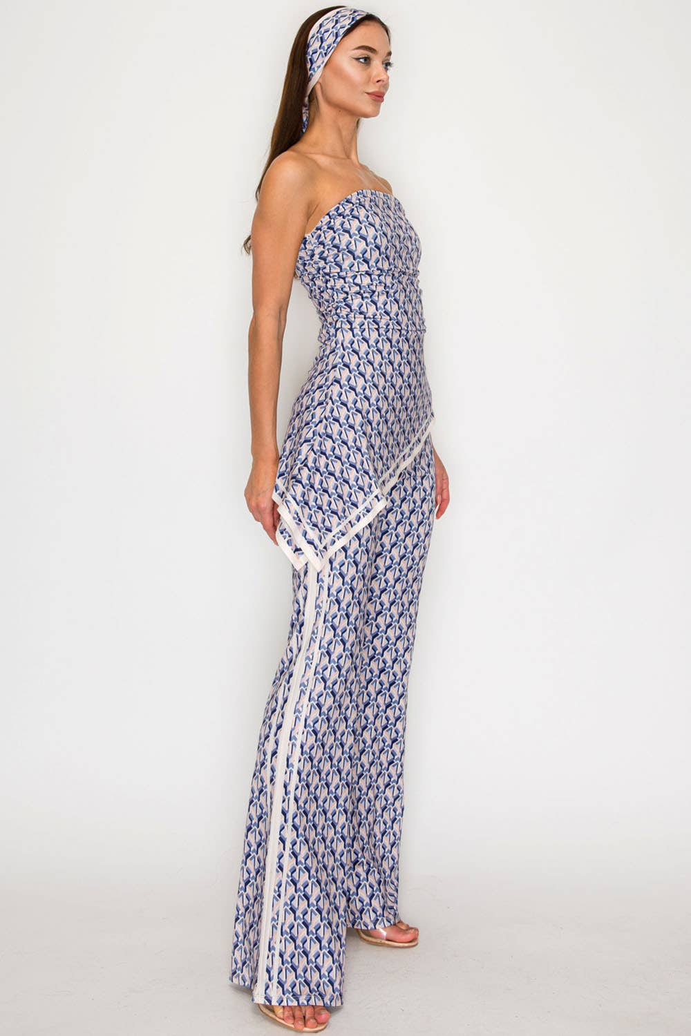 This jumpsuit also includes a matching scarf-style band that can be worn as a headband or styled in multiple ways for a versatile finishing touch.